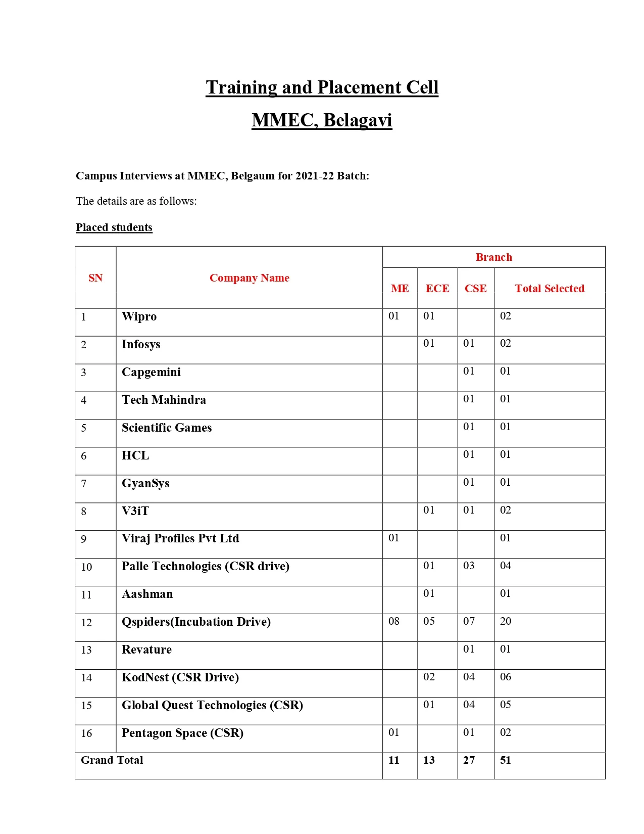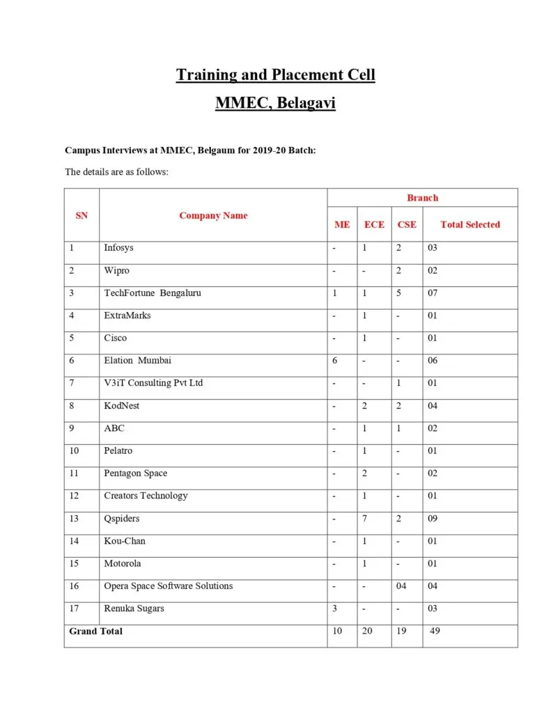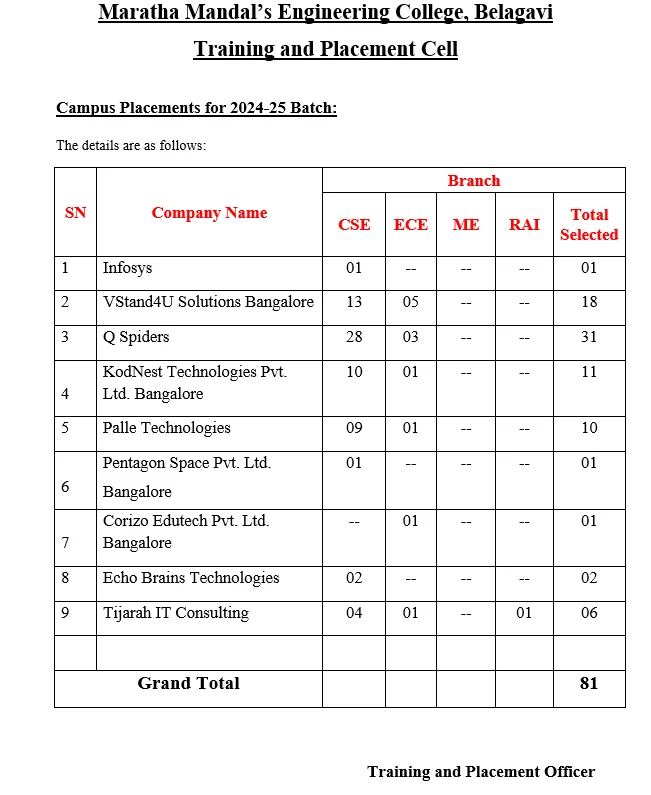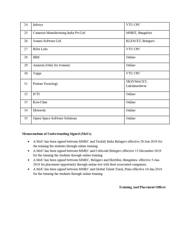 Maratha Mandal Engineering College [MMEC] is the affiliated college of the Visvesvaraya Technological University and has established a full-fledged Training and Placement Department with a experience in industry and academic institutions, as its head. The department is established to see to it that all the students are trained as per the required industry standards [Soft skills, Aptitude and Technical Skills] apart from the academic curriculum to build their career and place in the reputed organization in India & abroad. The department contacts industries and invites the company HR representatives Technical personnel for campus recruitments and guest lecture’s. MMEC provides them the local hospitality and other infrastructural facilities to the industry representatives to effectively and efficiently conduct campus selection programmes. Past two years, the department has been successful in getting a number of industries to visit MMEC for campus recruitment.